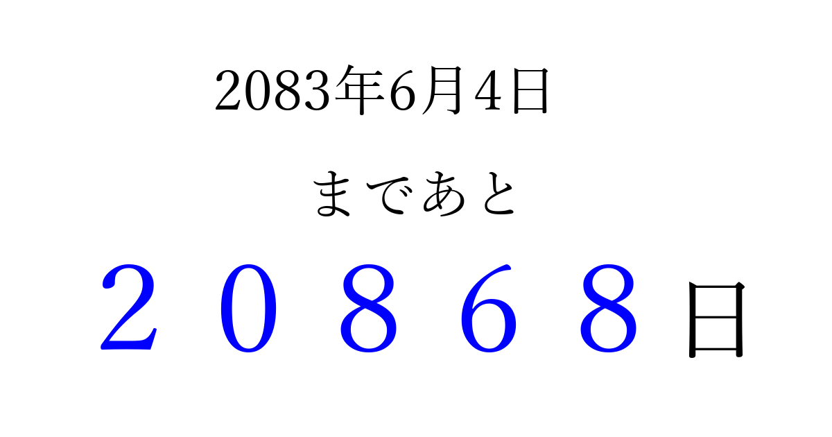 2083年6月4日(金)まで あと 99999 日です 追加すると、トップページからすぐ選べるようになります ※2026/04/16現在の結果です。 最新の状態に更新する ↓シェアして、タイムライン上にカウントダウンを表示しよう!↓ 📤 この結果を共有する Tweet シェア Threads Bluesky 別の日付でカウントダウン 2083年6月のカレンダー このページをブックマークに追加すると、いつでもカウントダウンを確認できます。 (PC: Ctrl+D / Mac: ⌘+D) hitome-notes.comでは以下のページも運営しています。 指定日と期間から日付を計算 | ガチャ確率計算・シミュレーション | プライバシー・ポリシー 運営者:Avocado