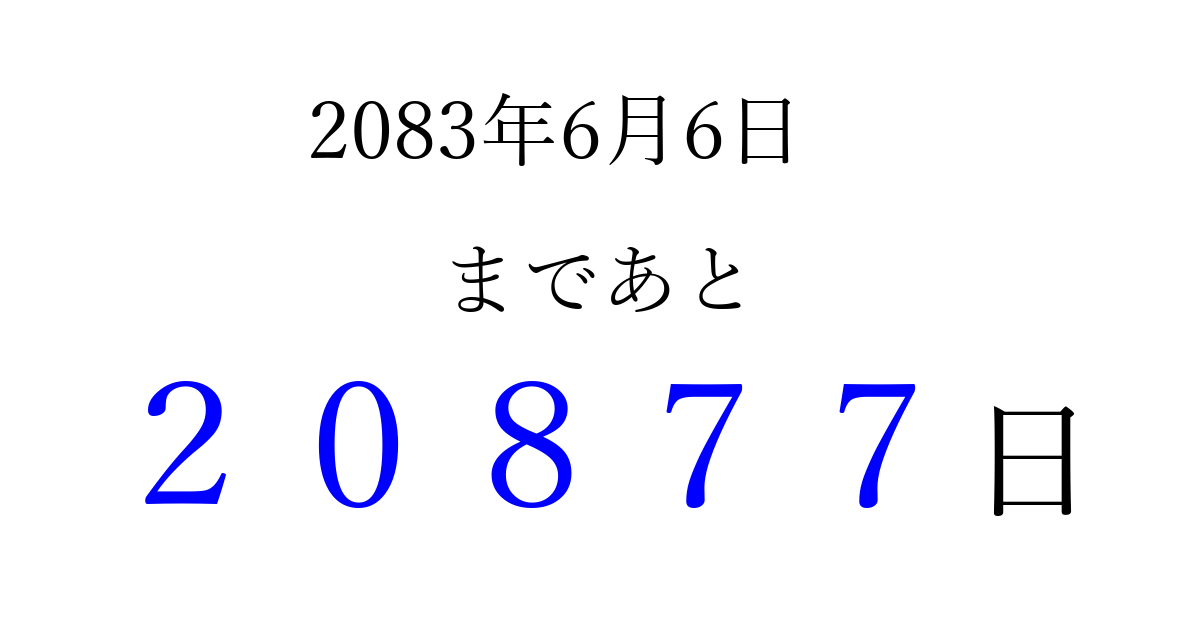 2083年6月6日(日)まで あと 99999 日です 追加すると、トップページからすぐ選べるようになります ※2026/04/09現在の結果です。 最新の状態に更新する ↓シェアして、タイムライン上にカウントダウンを表示しよう!↓ 📤 この結果を共有する Tweet シェア Threads Bluesky 別の日付でカウントダウン 2083年6月のカレンダー このページをブックマークに追加すると、いつでもカウントダウンを確認できます。 (PC: Ctrl+D / Mac: ⌘+D) hitome-notes.comでは以下のページも運営しています。 指定日と期間から日付を計算 | ガチャ確率計算・シミュレーション | プライバシー・ポリシー 運営者:Avocado