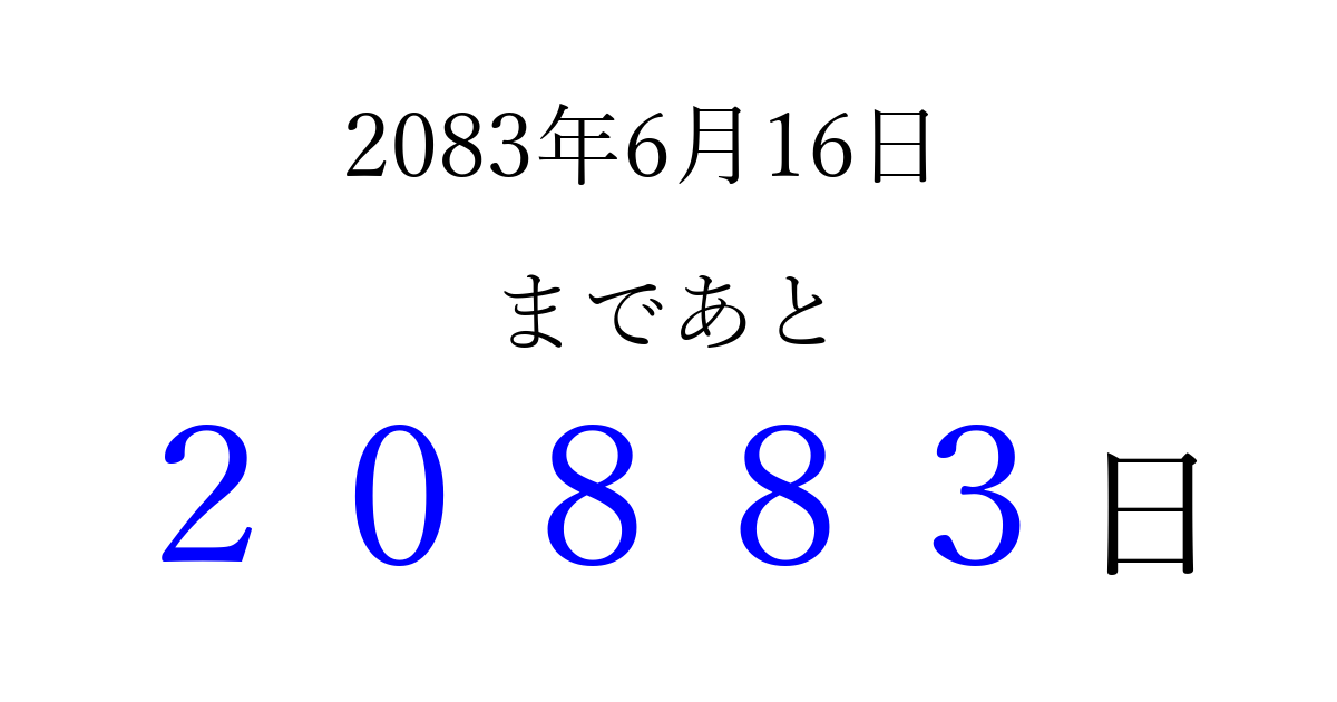 2083年6月16日(水)まで あと 99999 日です 追加すると、トップページからすぐ選べるようになります ※2026/04/13現在の結果です。 最新の状態に更新する ↓シェアして、タイムライン上にカウントダウンを表示しよう!↓ 📤 この結果を共有する Tweet シェア Threads Bluesky 別の日付でカウントダウン 2083年6月のカレンダー このページをブックマークに追加すると、いつでもカウントダウンを確認できます。 (PC: Ctrl+D / Mac: ⌘+D) hitome-notes.comでは以下のページも運営しています。 指定日と期間から日付を計算 | ガチャ確率計算・シミュレーション | プライバシー・ポリシー 運営者:Avocado
