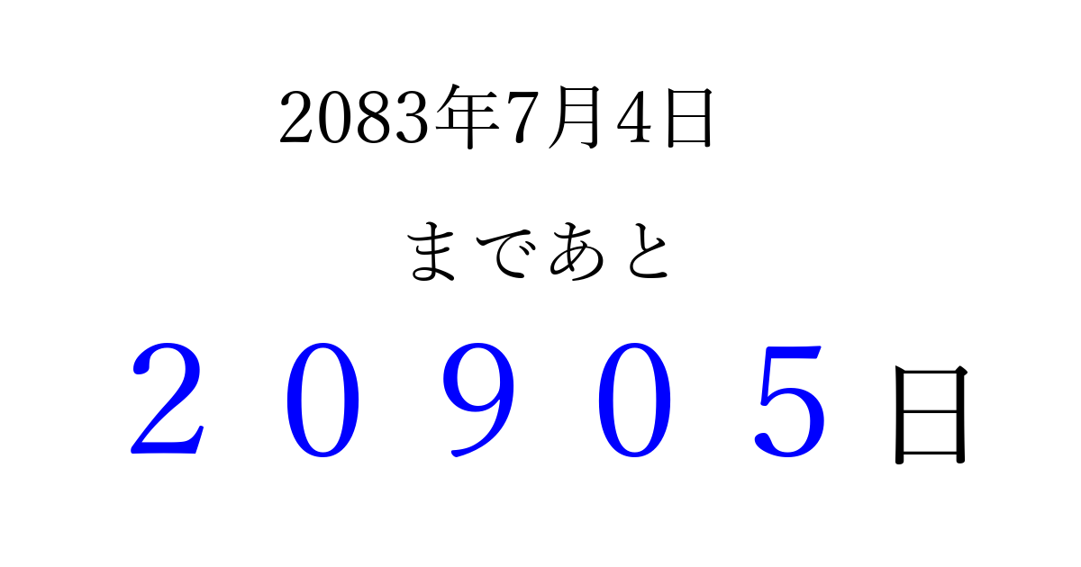 2083年7月4日(日)まで あと 99999 日です 追加すると、トップページからすぐ選べるようになります ※2026/04/09現在の結果です。 最新の状態に更新する ↓シェアして、タイムライン上にカウントダウンを表示しよう!↓ 📤 この結果を共有する Tweet シェア Threads Bluesky 別の日付でカウントダウン 2083年7月のカレンダー このページをブックマークに追加すると、いつでもカウントダウンを確認できます。 (PC: Ctrl+D / Mac: ⌘+D) hitome-notes.comでは以下のページも運営しています。 指定日と期間から日付を計算 | ガチャ確率計算・シミュレーション | プライバシー・ポリシー 運営者:Avocado