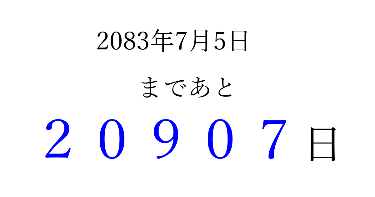 2083年7月5日(月)まで あと 99999 日です 追加すると、トップページからすぐ選べるようになります ※2026/04/08現在の結果です。 最新の状態に更新する ↓シェアして、タイムライン上にカウントダウンを表示しよう!↓ 📤 この結果を共有する Tweet シェア Threads Bluesky 別の日付でカウントダウン 2083年7月のカレンダー このページをブックマークに追加すると、いつでもカウントダウンを確認できます。 (PC: Ctrl+D / Mac: ⌘+D) hitome-notes.comでは以下のページも運営しています。 指定日と期間から日付を計算 | ガチャ確率計算・シミュレーション | プライバシー・ポリシー 運営者:Avocado