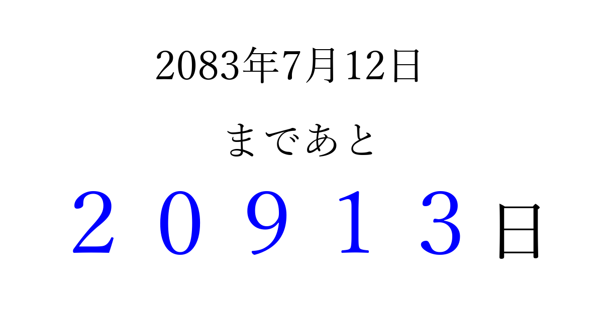 2083年7月12日(月)まで あと 99999 日です 追加すると、トップページからすぐ選べるようになります ※2026/04/09現在の結果です。 最新の状態に更新する ↓シェアして、タイムライン上にカウントダウンを表示しよう!↓ 📤 この結果を共有する Tweet シェア Threads Bluesky 別の日付でカウントダウン 2083年7月のカレンダー このページをブックマークに追加すると、いつでもカウントダウンを確認できます。 (PC: Ctrl+D / Mac: ⌘+D) hitome-notes.comでは以下のページも運営しています。 指定日と期間から日付を計算 | ガチャ確率計算・シミュレーション | プライバシー・ポリシー 運営者:Avocado