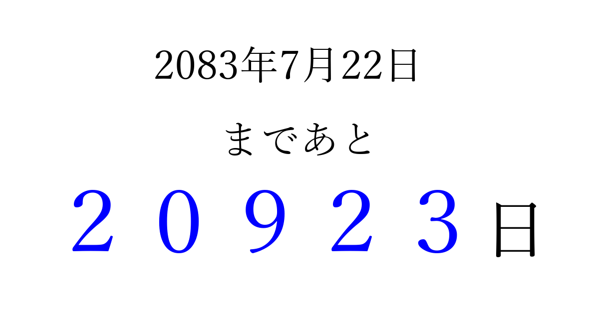 2083年7月22日(木)まで あと 99999 日です 追加すると、トップページからすぐ選べるようになります ※2026/04/09現在の結果です。 最新の状態に更新する ↓シェアして、タイムライン上にカウントダウンを表示しよう!↓ 📤 この結果を共有する Tweet シェア Threads Bluesky 別の日付でカウントダウン 2083年7月のカレンダー このページをブックマークに追加すると、いつでもカウントダウンを確認できます。 (PC: Ctrl+D / Mac: ⌘+D) hitome-notes.comでは以下のページも運営しています。 指定日と期間から日付を計算 | ガチャ確率計算・シミュレーション | プライバシー・ポリシー 運営者:Avocado