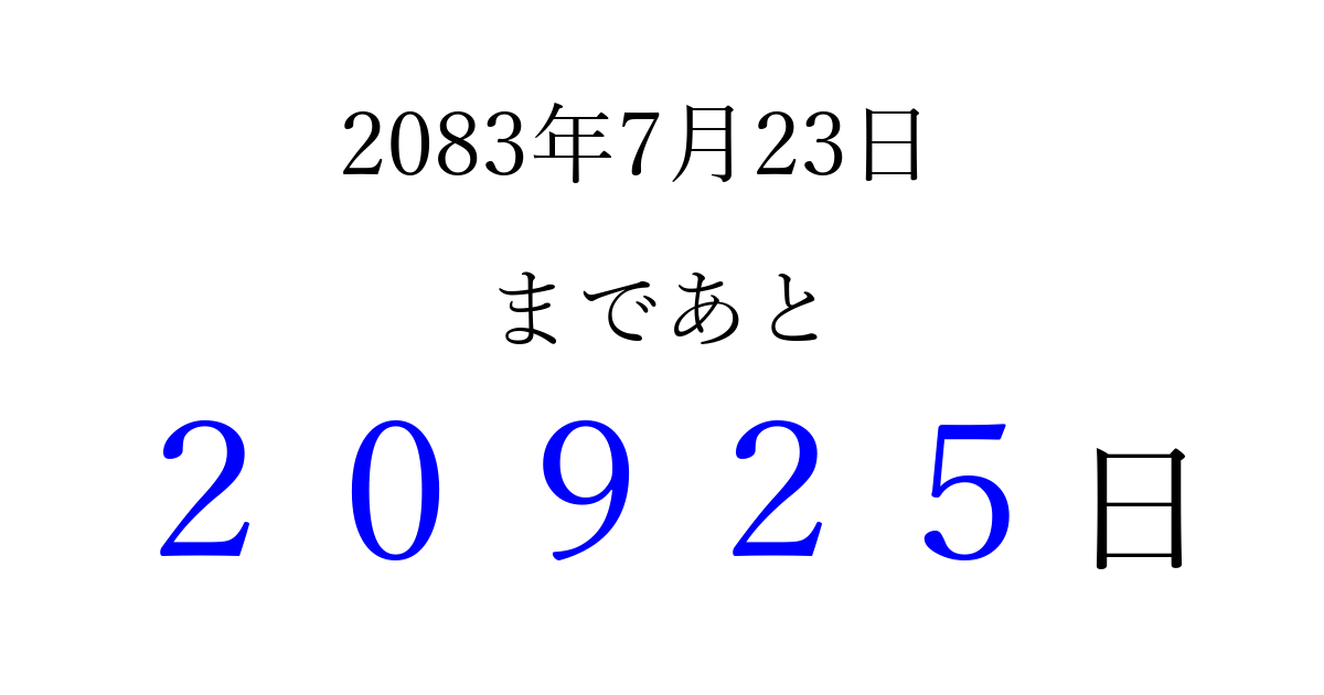 2083年7月23日(金)まで あと 99999 日です 追加すると、トップページからすぐ選べるようになります ※2026/04/08現在の結果です。 最新の状態に更新する ↓シェアして、タイムライン上にカウントダウンを表示しよう!↓ 📤 この結果を共有する Tweet シェア Threads Bluesky 別の日付でカウントダウン 2083年7月のカレンダー このページをブックマークに追加すると、いつでもカウントダウンを確認できます。 (PC: Ctrl+D / Mac: ⌘+D) hitome-notes.comでは以下のページも運営しています。 指定日と期間から日付を計算 | ガチャ確率計算・シミュレーション | プライバシー・ポリシー 運営者:Avocado