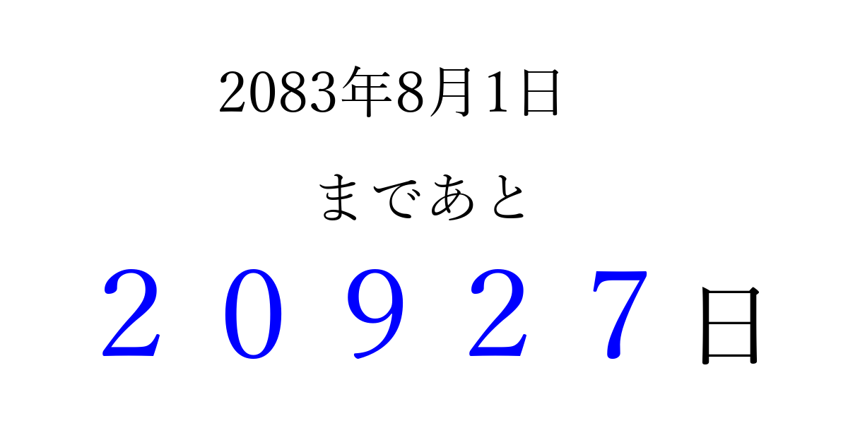 2083年8月1日(日)まで あと 99999 日です 追加すると、トップページからすぐ選べるようになります ※2026/04/15現在の結果です。 最新の状態に更新する ↓シェアして、タイムライン上にカウントダウンを表示しよう!↓ 📤 この結果を共有する Tweet シェア Threads Bluesky 別の日付でカウントダウン 2083年8月のカレンダー このページをブックマークに追加すると、いつでもカウントダウンを確認できます。 (PC: Ctrl+D / Mac: ⌘+D) hitome-notes.comでは以下のページも運営しています。 指定日と期間から日付を計算 | ガチャ確率計算・シミュレーション | プライバシー・ポリシー 運営者:Avocado