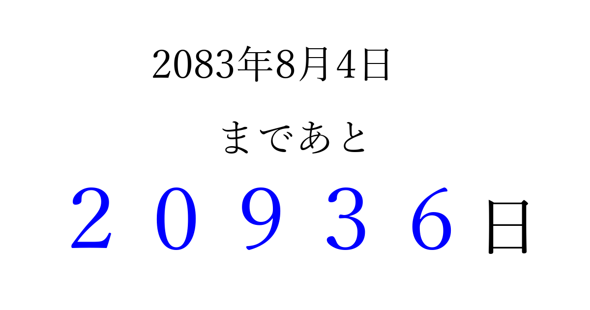 2083年8月4日(水)まで あと 99999 日です 追加すると、トップページからすぐ選べるようになります ※2026/04/09現在の結果です。 最新の状態に更新する ↓シェアして、タイムライン上にカウントダウンを表示しよう!↓ 📤 この結果を共有する Tweet シェア Threads Bluesky 別の日付でカウントダウン 2083年8月のカレンダー このページをブックマークに追加すると、いつでもカウントダウンを確認できます。 (PC: Ctrl+D / Mac: ⌘+D) hitome-notes.comでは以下のページも運営しています。 指定日と期間から日付を計算 | ガチャ確率計算・シミュレーション | プライバシー・ポリシー 運営者:Avocado