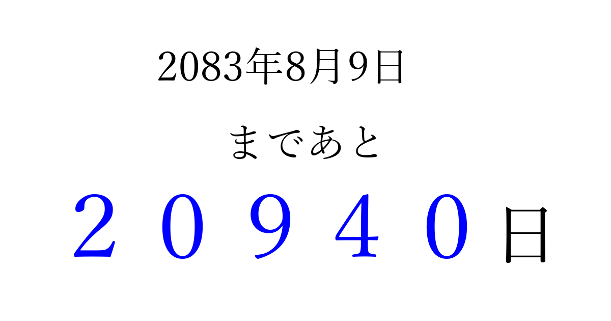 2083年8月9日(月)まで あと 99999 日です 追加すると、トップページからすぐ選べるようになります ※2026/04/10現在の結果です。 最新の状態に更新する ↓シェアして、タイムライン上にカウントダウンを表示しよう!↓ 📤 この結果を共有する Tweet シェア Threads Bluesky 別の日付でカウントダウン 2083年8月のカレンダー このページをブックマークに追加すると、いつでもカウントダウンを確認できます。 (PC: Ctrl+D / Mac: ⌘+D) hitome-notes.comでは以下のページも運営しています。 指定日と期間から日付を計算 | ガチャ確率計算・シミュレーション | プライバシー・ポリシー 運営者:Avocado