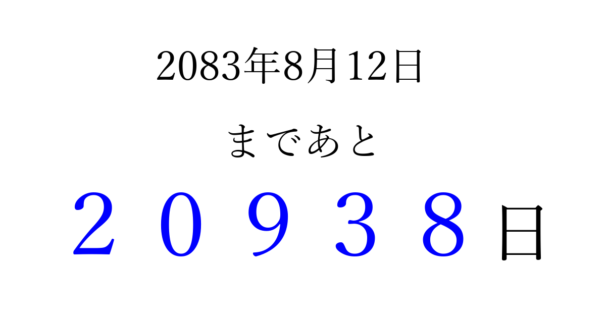 2083年8月12日(木)まで あと 99999 日です 追加すると、トップページからすぐ選べるようになります ※2026/04/15現在の結果です。 最新の状態に更新する ↓シェアして、タイムライン上にカウントダウンを表示しよう!↓ 📤 この結果を共有する Tweet シェア Threads Bluesky 別の日付でカウントダウン 2083年8月のカレンダー このページをブックマークに追加すると、いつでもカウントダウンを確認できます。 (PC: Ctrl+D / Mac: ⌘+D) hitome-notes.comでは以下のページも運営しています。 指定日と期間から日付を計算 | ガチャ確率計算・シミュレーション | プライバシー・ポリシー 運営者:Avocado