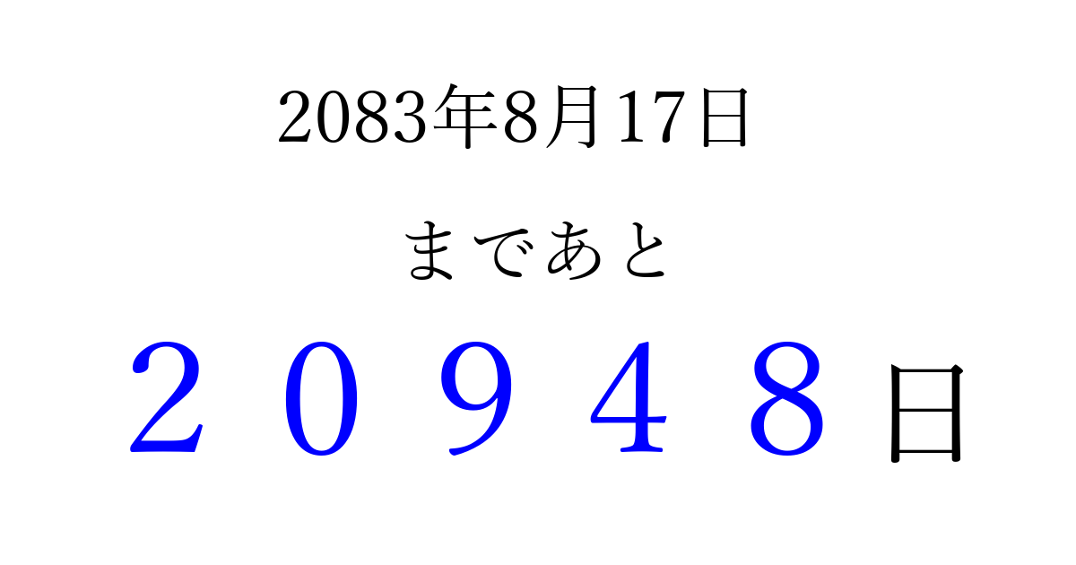 2083年8月17日(火)まで あと 99999 日です 追加すると、トップページからすぐ選べるようになります ※2026/04/10現在の結果です。 最新の状態に更新する ↓シェアして、タイムライン上にカウントダウンを表示しよう!↓ 📤 この結果を共有する Tweet シェア Threads Bluesky 別の日付でカウントダウン 2083年8月のカレンダー このページをブックマークに追加すると、いつでもカウントダウンを確認できます。 (PC: Ctrl+D / Mac: ⌘+D) hitome-notes.comでは以下のページも運営しています。 指定日と期間から日付を計算 | ガチャ確率計算・シミュレーション | プライバシー・ポリシー 運営者:Avocado