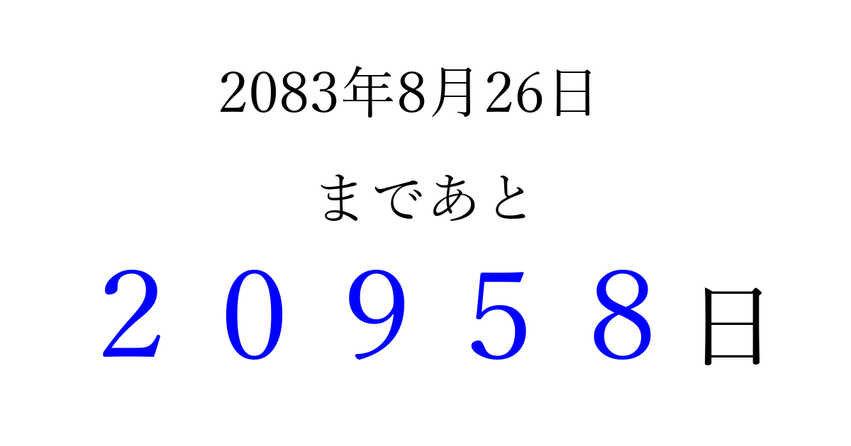2083年8月26日(木)まで あと 99999 日です 追加すると、トップページからすぐ選べるようになります ※2026/04/09現在の結果です。 最新の状態に更新する ↓シェアして、タイムライン上にカウントダウンを表示しよう!↓ 📤 この結果を共有する Tweet シェア Threads Bluesky 別の日付でカウントダウン 2083年8月のカレンダー このページをブックマークに追加すると、いつでもカウントダウンを確認できます。 (PC: Ctrl+D / Mac: ⌘+D) hitome-notes.comでは以下のページも運営しています。 指定日と期間から日付を計算 | ガチャ確率計算・シミュレーション | プライバシー・ポリシー 運営者:Avocado