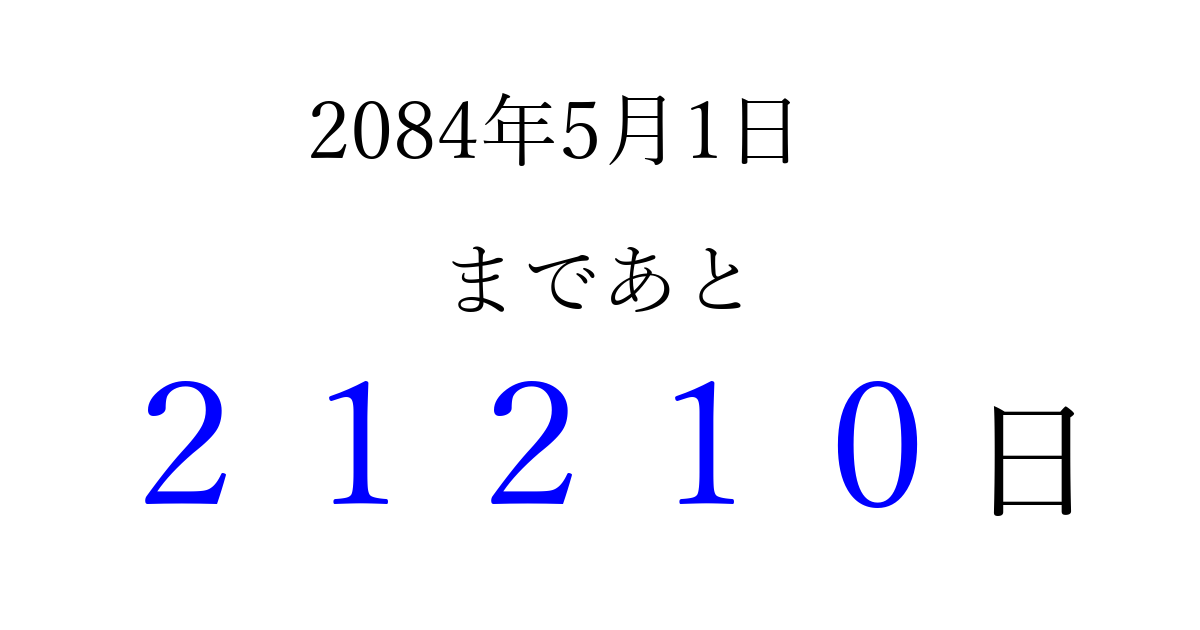 2084年5月1日(月)まで あと 99999 日です 追加すると、トップページからすぐ選べるようになります ※2026/04/06現在の結果です。 最新の状態に更新する ↓シェアして、タイムライン上にカウントダウンを表示しよう!↓ 📤 この結果を共有する Tweet シェア Threads Bluesky 別の日付でカウントダウン 2084年5月のカレンダー このページをブックマークに追加すると、いつでもカウントダウンを確認できます。 (PC: Ctrl+D / Mac: ⌘+D) hitome-notes.comでは以下のページも運営しています。 指定日と期間から日付を計算 | ガチャ確率計算・シミュレーション | プライバシー・ポリシー 運営者:Avocado