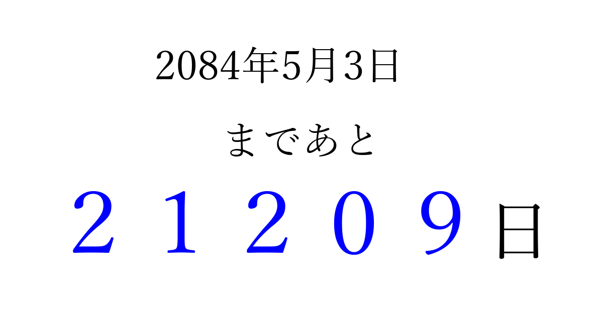 2084年5月3日(水)まで あと 99999 日です 追加すると、トップページからすぐ選べるようになります ※2026/04/09現在の結果です。 最新の状態に更新する ↓シェアして、タイムライン上にカウントダウンを表示しよう!↓ 📤 この結果を共有する Tweet シェア Threads Bluesky 別の日付でカウントダウン 2084年5月のカレンダー このページをブックマークに追加すると、いつでもカウントダウンを確認できます。 (PC: Ctrl+D / Mac: ⌘+D) hitome-notes.comでは以下のページも運営しています。 指定日と期間から日付を計算 | ガチャ確率計算・シミュレーション | プライバシー・ポリシー 運営者:Avocado
