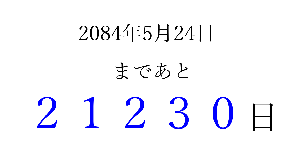 2084年5月24日(水)まで あと 99999 日です 追加すると、トップページからすぐ選べるようになります ※2026/04/09現在の結果です。 最新の状態に更新する ↓シェアして、タイムライン上にカウントダウンを表示しよう!↓ 📤 この結果を共有する Tweet シェア Threads Bluesky 別の日付でカウントダウン 2084年5月のカレンダー このページをブックマークに追加すると、いつでもカウントダウンを確認できます。 (PC: Ctrl+D / Mac: ⌘+D) hitome-notes.comでは以下のページも運営しています。 指定日と期間から日付を計算 | ガチャ確率計算・シミュレーション | プライバシー・ポリシー 運営者:Avocado