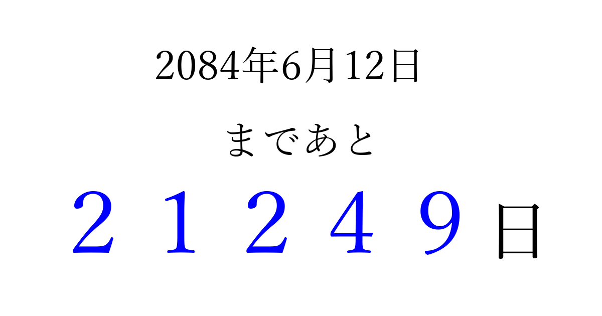2084年6月12日(月)まで あと 99999 日です 追加すると、トップページからすぐ選べるようになります ※2026/04/09現在の結果です。 最新の状態に更新する ↓シェアして、タイムライン上にカウントダウンを表示しよう!↓ 📤 この結果を共有する Tweet シェア Threads Bluesky 別の日付でカウントダウン 2084年6月のカレンダー このページをブックマークに追加すると、いつでもカウントダウンを確認できます。 (PC: Ctrl+D / Mac: ⌘+D) hitome-notes.comでは以下のページも運営しています。 指定日と期間から日付を計算 | ガチャ確率計算・シミュレーション | プライバシー・ポリシー 運営者:Avocado