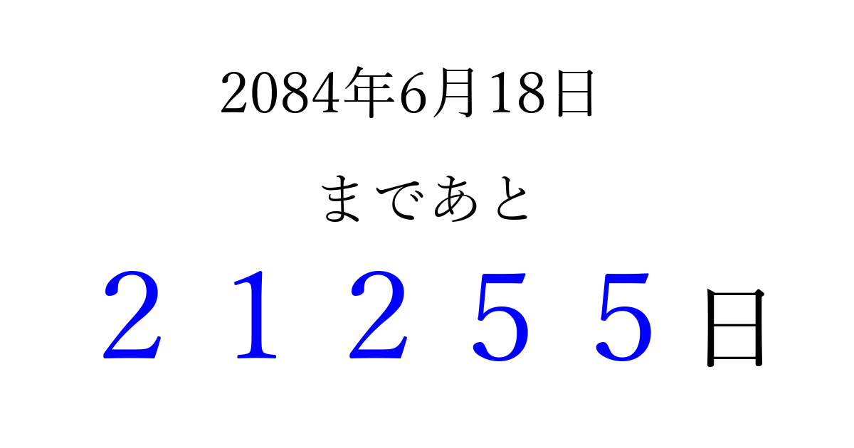 2084年6月18日(日)まで あと 99999 日です 追加すると、トップページからすぐ選べるようになります ※2026/04/09現在の結果です。 最新の状態に更新する ↓シェアして、タイムライン上にカウントダウンを表示しよう!↓ 📤 この結果を共有する Tweet シェア Threads Bluesky 別の日付でカウントダウン 2084年6月のカレンダー このページをブックマークに追加すると、いつでもカウントダウンを確認できます。 (PC: Ctrl+D / Mac: ⌘+D) hitome-notes.comでは以下のページも運営しています。 指定日と期間から日付を計算 | ガチャ確率計算・シミュレーション | プライバシー・ポリシー 運営者:Avocado