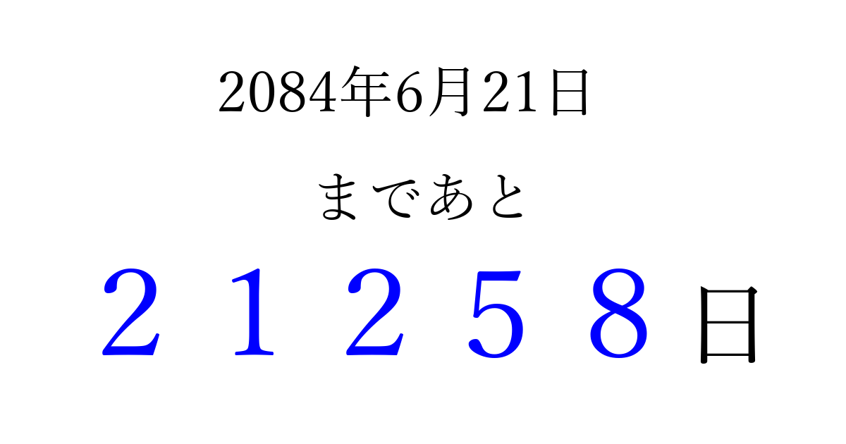 2084年6月21日(水)まで あと 99999 日です 追加すると、トップページからすぐ選べるようになります ※2026/04/09現在の結果です。 最新の状態に更新する ↓シェアして、タイムライン上にカウントダウンを表示しよう!↓ 📤 この結果を共有する Tweet シェア Threads Bluesky 別の日付でカウントダウン 2084年6月のカレンダー このページをブックマークに追加すると、いつでもカウントダウンを確認できます。 (PC: Ctrl+D / Mac: ⌘+D) hitome-notes.comでは以下のページも運営しています。 指定日と期間から日付を計算 | ガチャ確率計算・シミュレーション | プライバシー・ポリシー 運営者:Avocado