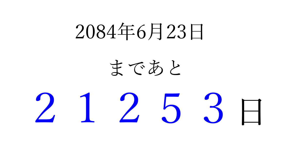 2084年6月23日(金)まで あと 99999 日です 追加すると、トップページからすぐ選べるようになります ※2026/04/16現在の結果です。 最新の状態に更新する ↓シェアして、タイムライン上にカウントダウンを表示しよう!↓ 📤 この結果を共有する Tweet シェア Threads Bluesky 別の日付でカウントダウン 2084年6月のカレンダー このページをブックマークに追加すると、いつでもカウントダウンを確認できます。 (PC: Ctrl+D / Mac: ⌘+D) hitome-notes.comでは以下のページも運営しています。 指定日と期間から日付を計算 | ガチャ確率計算・シミュレーション | プライバシー・ポリシー 運営者:Avocado