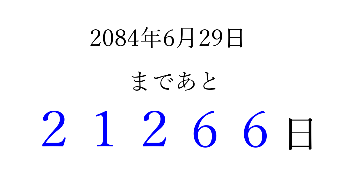 2084年6月29日(木)まで あと 99999 日です 追加すると、トップページからすぐ選べるようになります ※2026/04/09現在の結果です。 最新の状態に更新する ↓シェアして、タイムライン上にカウントダウンを表示しよう!↓ 📤 この結果を共有する Tweet シェア Threads Bluesky 別の日付でカウントダウン 2084年6月のカレンダー このページをブックマークに追加すると、いつでもカウントダウンを確認できます。 (PC: Ctrl+D / Mac: ⌘+D) hitome-notes.comでは以下のページも運営しています。 指定日と期間から日付を計算 | ガチャ確率計算・シミュレーション | プライバシー・ポリシー 運営者:Avocado