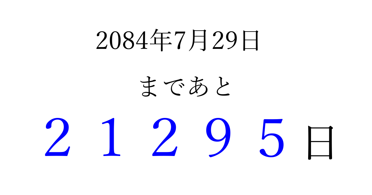 2084年7月29日(土)まで あと 99999 日です 追加すると、トップページからすぐ選べるようになります ※2026/04/10現在の結果です。 最新の状態に更新する ↓シェアして、タイムライン上にカウントダウンを表示しよう!↓ 📤 この結果を共有する Tweet シェア Threads Bluesky 別の日付でカウントダウン 2084年7月のカレンダー このページをブックマークに追加すると、いつでもカウントダウンを確認できます。 (PC: Ctrl+D / Mac: ⌘+D) hitome-notes.comでは以下のページも運営しています。 指定日と期間から日付を計算 | ガチャ確率計算・シミュレーション | プライバシー・ポリシー 運営者:Avocado