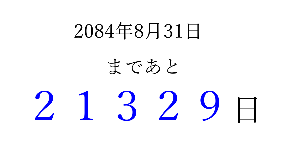 2084年8月31日(木)まで あと 99999 日です 追加すると、トップページからすぐ選べるようになります ※2026/04/09現在の結果です。 最新の状態に更新する ↓シェアして、タイムライン上にカウントダウンを表示しよう!↓ 📤 この結果を共有する Tweet シェア Threads Bluesky 別の日付でカウントダウン 2084年8月のカレンダー このページをブックマークに追加すると、いつでもカウントダウンを確認できます。 (PC: Ctrl+D / Mac: ⌘+D) hitome-notes.comでは以下のページも運営しています。 指定日と期間から日付を計算 | ガチャ確率計算・シミュレーション | プライバシー・ポリシー 運営者:Avocado