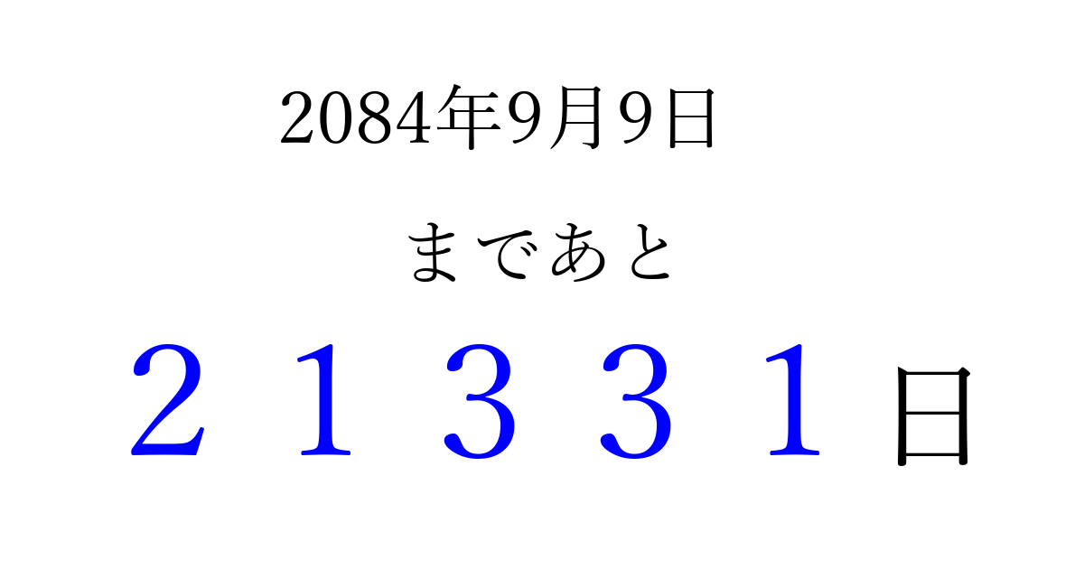 2084年9月9日(土)まで あと 99999 日です 追加すると、トップページからすぐ選べるようになります ※2026/04/16現在の結果です。 最新の状態に更新する ↓シェアして、タイムライン上にカウントダウンを表示しよう!↓ 📤 この結果を共有する Tweet シェア Threads Bluesky 別の日付でカウントダウン 2084年9月のカレンダー このページをブックマークに追加すると、いつでもカウントダウンを確認できます。 (PC: Ctrl+D / Mac: ⌘+D) hitome-notes.comでは以下のページも運営しています。 指定日と期間から日付を計算 | ガチャ確率計算・シミュレーション | プライバシー・ポリシー 運営者:Avocado