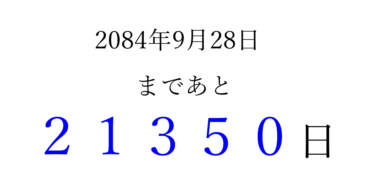 2084年9月28日(木)まで あと 99999 日です 追加すると、トップページからすぐ選べるようになります ※2026/04/16現在の結果です。 最新の状態に更新する ↓シェアして、タイムライン上にカウントダウンを表示しよう!↓ 📤 この結果を共有する Tweet シェア Threads Bluesky 別の日付でカウントダウン 2084年9月のカレンダー このページをブックマークに追加すると、いつでもカウントダウンを確認できます。 (PC: Ctrl+D / Mac: ⌘+D) hitome-notes.comでは以下のページも運営しています。 指定日と期間から日付を計算 | ガチャ確率計算・シミュレーション | プライバシー・ポリシー 運営者:Avocado
