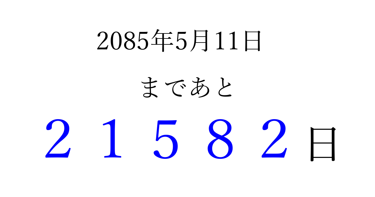 2085年5月11日(金)まで あと 99999 日です 追加すると、トップページからすぐ選べるようになります ※2026/04/09現在の結果です。 最新の状態に更新する ↓シェアして、タイムライン上にカウントダウンを表示しよう!↓ 📤 この結果を共有する Tweet シェア Threads Bluesky 別の日付でカウントダウン 2085年5月のカレンダー このページをブックマークに追加すると、いつでもカウントダウンを確認できます。 (PC: Ctrl+D / Mac: ⌘+D) hitome-notes.comでは以下のページも運営しています。 指定日と期間から日付を計算 | ガチャ確率計算・シミュレーション | プライバシー・ポリシー 運営者:Avocado