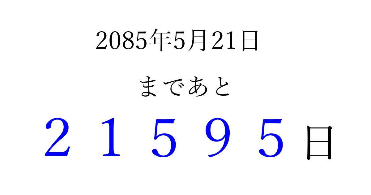 2085年5月21日(月)まで あと 99999 日です 追加すると、トップページからすぐ選べるようになります ※2026/04/06現在の結果です。 最新の状態に更新する ↓シェアして、タイムライン上にカウントダウンを表示しよう!↓ 📤 この結果を共有する Tweet シェア Threads Bluesky 別の日付でカウントダウン 2085年5月のカレンダー このページをブックマークに追加すると、いつでもカウントダウンを確認できます。 (PC: Ctrl+D / Mac: ⌘+D) hitome-notes.comでは以下のページも運営しています。 指定日と期間から日付を計算 | ガチャ確率計算・シミュレーション | プライバシー・ポリシー 運営者:Avocado