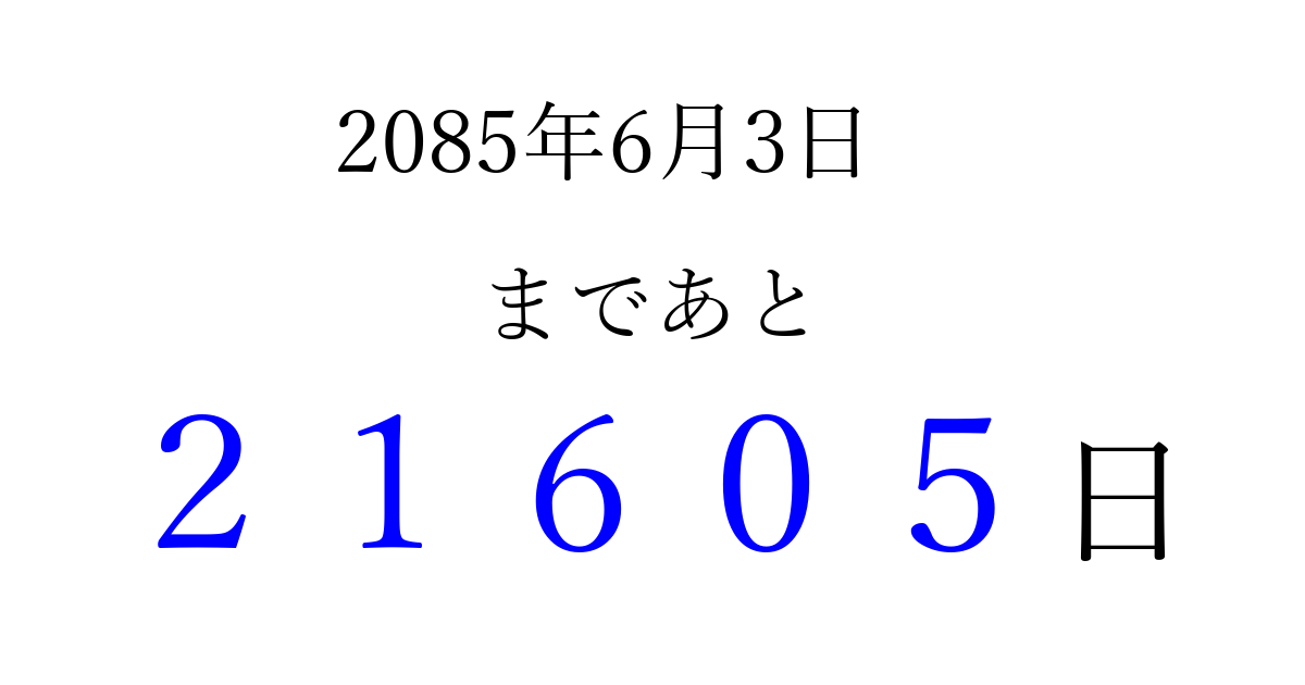2085年6月3日(日)まで あと 99999 日です 追加すると、トップページからすぐ選べるようになります ※2026/04/09現在の結果です。 最新の状態に更新する ↓シェアして、タイムライン上にカウントダウンを表示しよう!↓ 📤 この結果を共有する Tweet シェア Threads Bluesky 別の日付でカウントダウン 2085年6月のカレンダー このページをブックマークに追加すると、いつでもカウントダウンを確認できます。 (PC: Ctrl+D / Mac: ⌘+D) hitome-notes.comでは以下のページも運営しています。 指定日と期間から日付を計算 | ガチャ確率計算・シミュレーション | プライバシー・ポリシー 運営者:Avocado