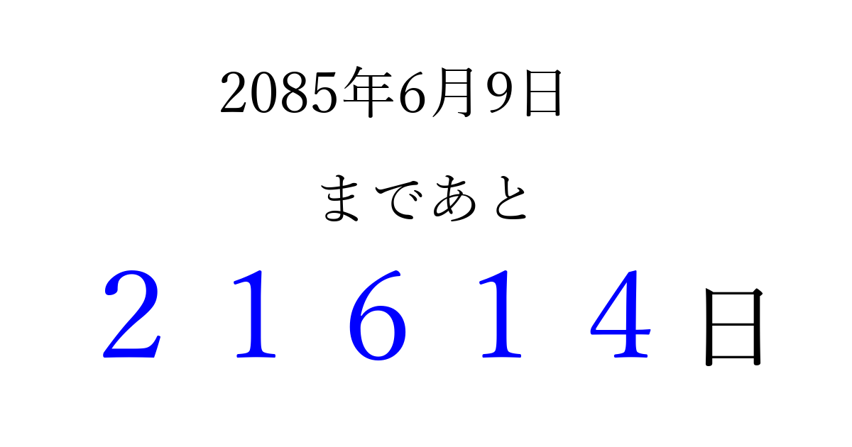 2085年6月9日(土)まで あと 99999 日です 追加すると、トップページからすぐ選べるようになります ※2026/04/06現在の結果です。 最新の状態に更新する ↓シェアして、タイムライン上にカウントダウンを表示しよう!↓ 📤 この結果を共有する Tweet シェア Threads Bluesky 別の日付でカウントダウン 2085年6月のカレンダー このページをブックマークに追加すると、いつでもカウントダウンを確認できます。 (PC: Ctrl+D / Mac: ⌘+D) hitome-notes.comでは以下のページも運営しています。 指定日と期間から日付を計算 | ガチャ確率計算・シミュレーション | プライバシー・ポリシー 運営者:Avocado