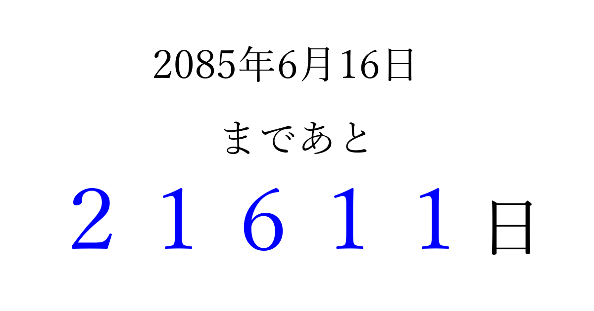 2085年6月16日(土)まで あと 99999 日です 追加すると、トップページからすぐ選べるようになります ※2026/04/16現在の結果です。 最新の状態に更新する ↓シェアして、タイムライン上にカウントダウンを表示しよう!↓ 📤 この結果を共有する Tweet シェア Threads Bluesky 別の日付でカウントダウン 2085年6月のカレンダー このページをブックマークに追加すると、いつでもカウントダウンを確認できます。 (PC: Ctrl+D / Mac: ⌘+D) hitome-notes.comでは以下のページも運営しています。 指定日と期間から日付を計算 | ガチャ確率計算・シミュレーション | プライバシー・ポリシー 運営者:Avocado