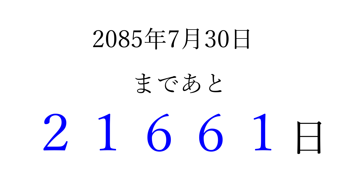 2085年7月30日(月)まで あと 99999 日です 追加すると、トップページからすぐ選べるようになります ※2026/04/10現在の結果です。 最新の状態に更新する ↓シェアして、タイムライン上にカウントダウンを表示しよう!↓ 📤 この結果を共有する Tweet シェア Threads Bluesky 別の日付でカウントダウン 2085年7月のカレンダー このページをブックマークに追加すると、いつでもカウントダウンを確認できます。 (PC: Ctrl+D / Mac: ⌘+D) hitome-notes.comでは以下のページも運営しています。 指定日と期間から日付を計算 | ガチャ確率計算・シミュレーション | プライバシー・ポリシー 運営者:Avocado