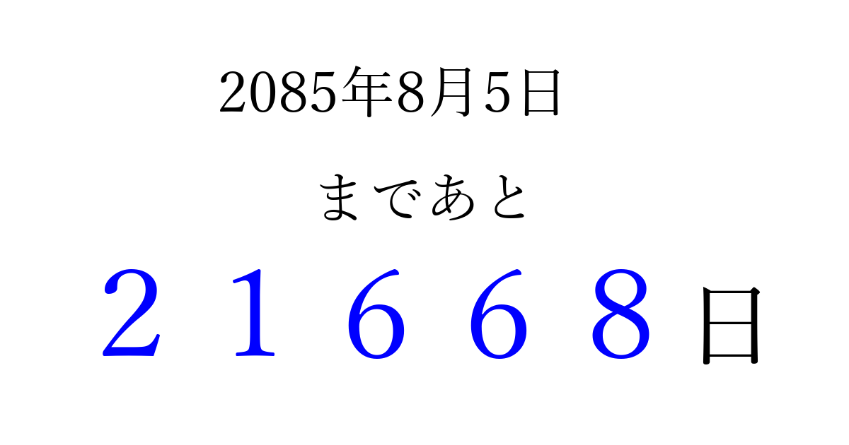 2085年8月5日(日)まで あと 99999 日です 追加すると、トップページからすぐ選べるようになります ※2026/04/09現在の結果です。 最新の状態に更新する ↓シェアして、タイムライン上にカウントダウンを表示しよう!↓ 📤 この結果を共有する Tweet シェア Threads Bluesky 別の日付でカウントダウン 2085年8月のカレンダー このページをブックマークに追加すると、いつでもカウントダウンを確認できます。 (PC: Ctrl+D / Mac: ⌘+D) hitome-notes.comでは以下のページも運営しています。 指定日と期間から日付を計算 | ガチャ確率計算・シミュレーション | プライバシー・ポリシー 運営者:Avocado