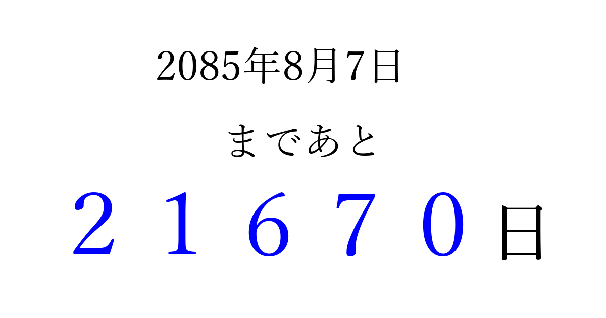 2085年8月7日(火)まで あと 99999 日です 追加すると、トップページからすぐ選べるようになります ※2026/04/09現在の結果です。 最新の状態に更新する ↓シェアして、タイムライン上にカウントダウンを表示しよう!↓ 📤 この結果を共有する Tweet シェア Threads Bluesky 別の日付でカウントダウン 2085年8月のカレンダー このページをブックマークに追加すると、いつでもカウントダウンを確認できます。 (PC: Ctrl+D / Mac: ⌘+D) hitome-notes.comでは以下のページも運営しています。 指定日と期間から日付を計算 | ガチャ確率計算・シミュレーション | プライバシー・ポリシー 運営者:Avocado