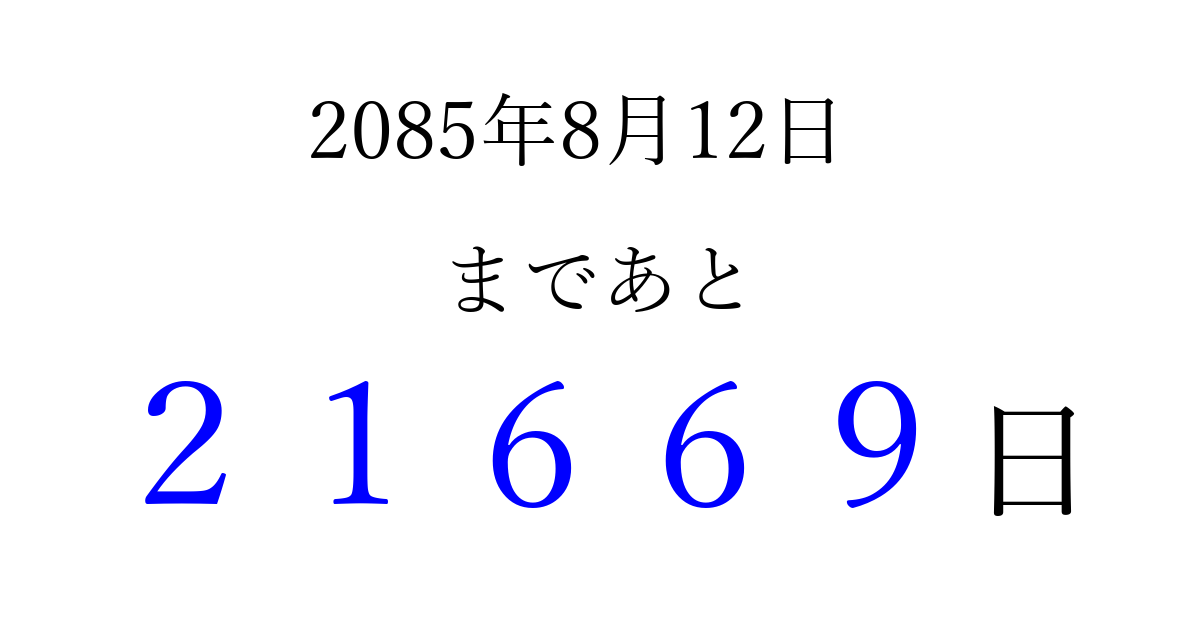 2085年8月12日(日)まで あと 99999 日です 追加すると、トップページからすぐ選べるようになります ※2026/04/15現在の結果です。 最新の状態に更新する ↓シェアして、タイムライン上にカウントダウンを表示しよう!↓ 📤 この結果を共有する Tweet シェア Threads Bluesky 別の日付でカウントダウン 2085年8月のカレンダー このページをブックマークに追加すると、いつでもカウントダウンを確認できます。 (PC: Ctrl+D / Mac: ⌘+D) hitome-notes.comでは以下のページも運営しています。 指定日と期間から日付を計算 | ガチャ確率計算・シミュレーション | プライバシー・ポリシー 運営者:Avocado