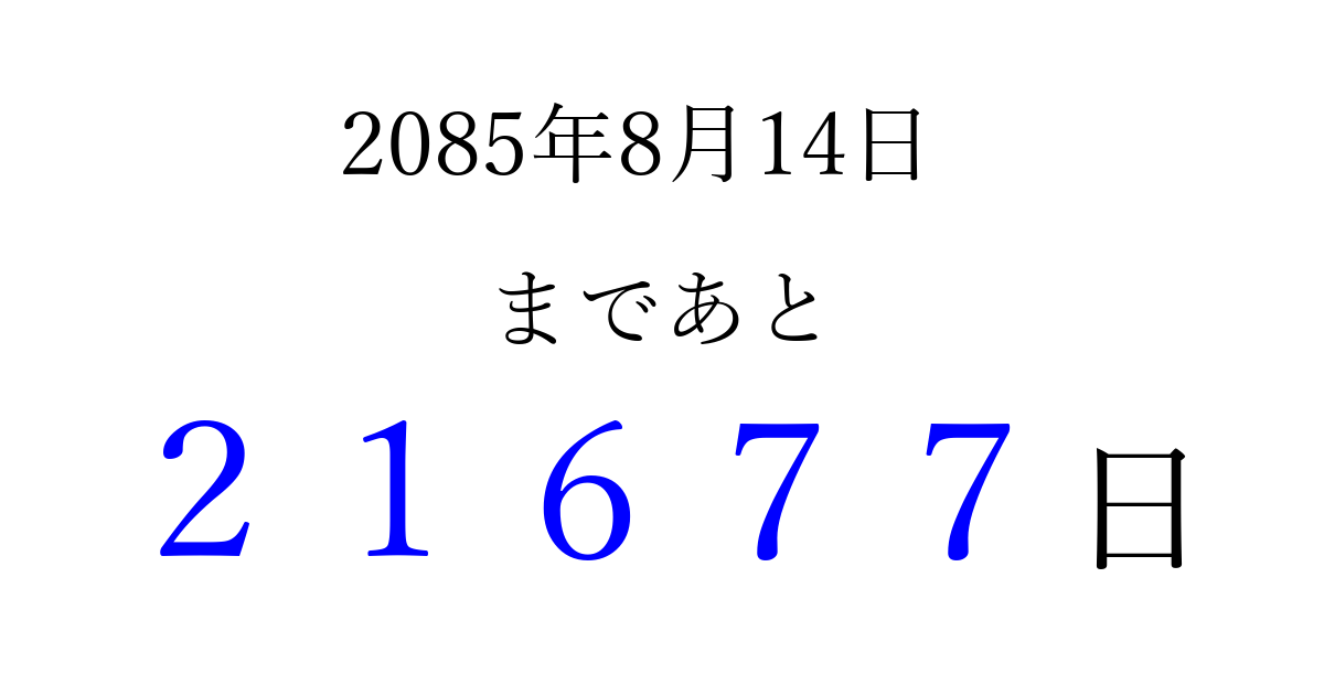 2085年8月14日(火)まで あと 99999 日です 追加すると、トップページからすぐ選べるようになります ※2026/04/09現在の結果です。 最新の状態に更新する ↓シェアして、タイムライン上にカウントダウンを表示しよう!↓ 📤 この結果を共有する Tweet シェア Threads Bluesky 別の日付でカウントダウン 2085年8月のカレンダー このページをブックマークに追加すると、いつでもカウントダウンを確認できます。 (PC: Ctrl+D / Mac: ⌘+D) hitome-notes.comでは以下のページも運営しています。 指定日と期間から日付を計算 | ガチャ確率計算・シミュレーション | プライバシー・ポリシー 運営者:Avocado