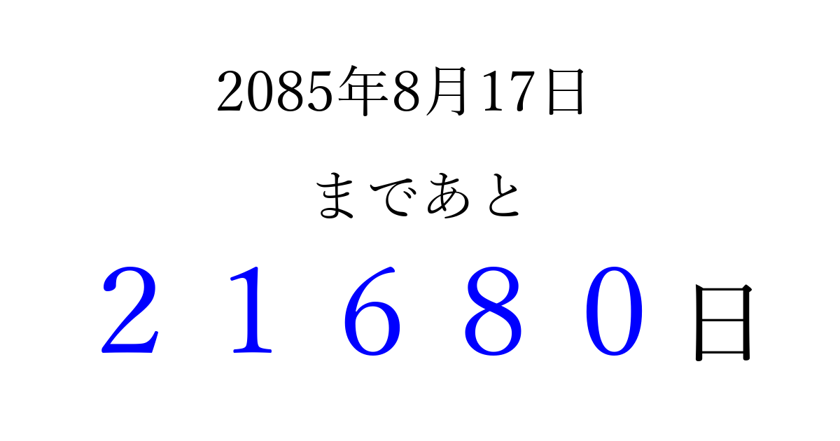 2085年8月17日(金)まで あと 99999 日です 追加すると、トップページからすぐ選べるようになります ※2026/04/09現在の結果です。 最新の状態に更新する ↓シェアして、タイムライン上にカウントダウンを表示しよう!↓ 📤 この結果を共有する Tweet シェア Threads Bluesky 別の日付でカウントダウン 2085年8月のカレンダー このページをブックマークに追加すると、いつでもカウントダウンを確認できます。 (PC: Ctrl+D / Mac: ⌘+D) hitome-notes.comでは以下のページも運営しています。 指定日と期間から日付を計算 | ガチャ確率計算・シミュレーション | プライバシー・ポリシー 運営者:Avocado