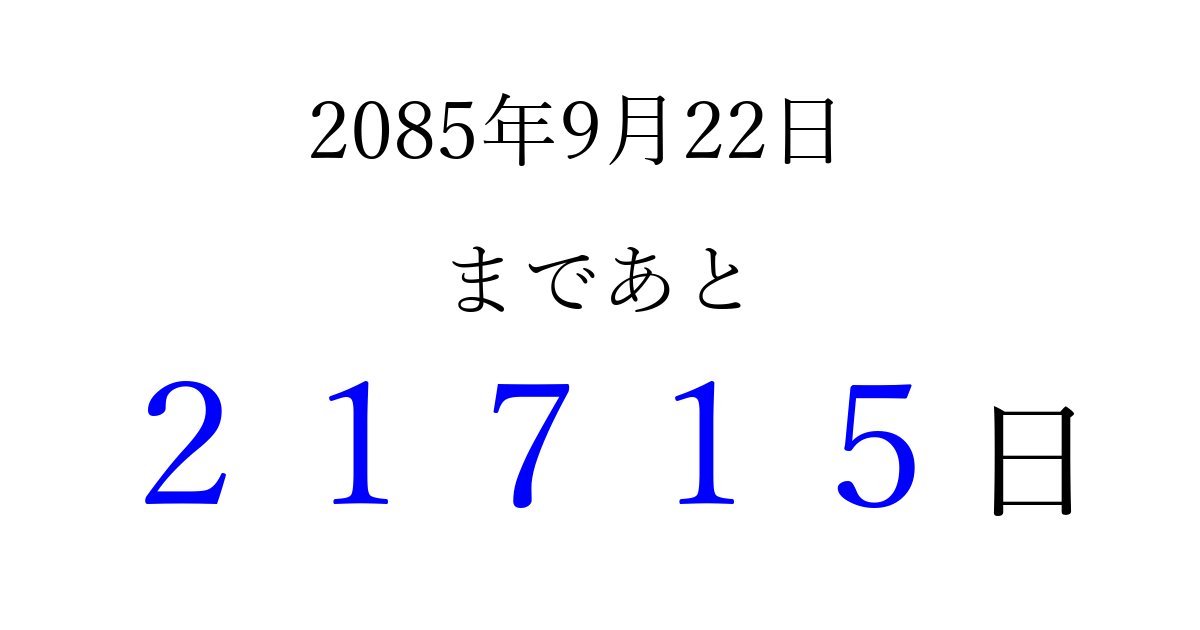 2085年9月22日(土)まで あと 99999 日です 追加すると、トップページからすぐ選べるようになります ※2026/04/10現在の結果です。 最新の状態に更新する ↓シェアして、タイムライン上にカウントダウンを表示しよう!↓ 📤 この結果を共有する Tweet シェア Threads Bluesky 別の日付でカウントダウン 2085年9月のカレンダー このページをブックマークに追加すると、いつでもカウントダウンを確認できます。 (PC: Ctrl+D / Mac: ⌘+D) hitome-notes.comでは以下のページも運営しています。 指定日と期間から日付を計算 | ガチャ確率計算・シミュレーション | プライバシー・ポリシー 運営者:Avocado