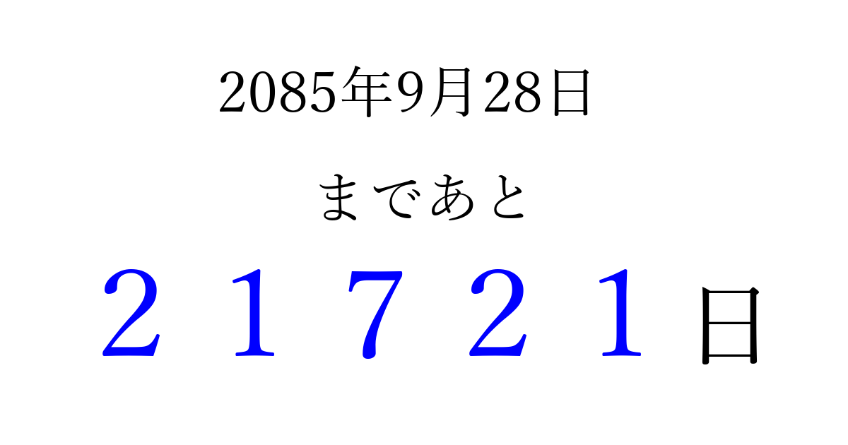 2085年9月28日(金)まで あと 99999 日です 追加すると、トップページからすぐ選べるようになります ※2026/04/10現在の結果です。 最新の状態に更新する ↓シェアして、タイムライン上にカウントダウンを表示しよう!↓ 📤 この結果を共有する Tweet シェア Threads Bluesky 別の日付でカウントダウン 2085年9月のカレンダー このページをブックマークに追加すると、いつでもカウントダウンを確認できます。 (PC: Ctrl+D / Mac: ⌘+D) hitome-notes.comでは以下のページも運営しています。 指定日と期間から日付を計算 | ガチャ確率計算・シミュレーション | プライバシー・ポリシー 運営者:Avocado