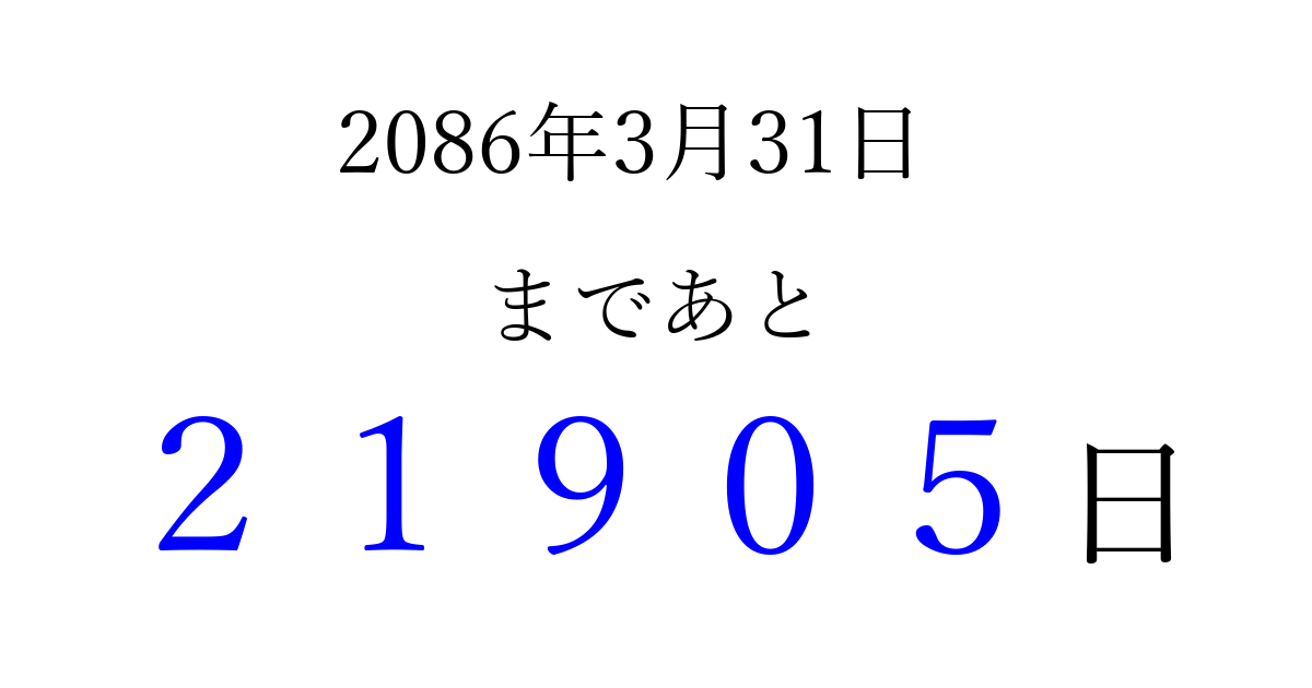 2086年3月31日(日)まで あと 99999 日です 追加すると、トップページからすぐ選べるようになります ※2026/04/10現在の結果です。 最新の状態に更新する ↓シェアして、タイムライン上にカウントダウンを表示しよう!↓ 📤 この結果を共有する Tweet シェア Threads Bluesky 別の日付でカウントダウン 2086年3月のカレンダー このページをブックマークに追加すると、いつでもカウントダウンを確認できます。 (PC: Ctrl+D / Mac: ⌘+D) hitome-notes.comでは以下のページも運営しています。 指定日と期間から日付を計算 | ガチャ確率計算・シミュレーション | プライバシー・ポリシー 運営者:Avocado