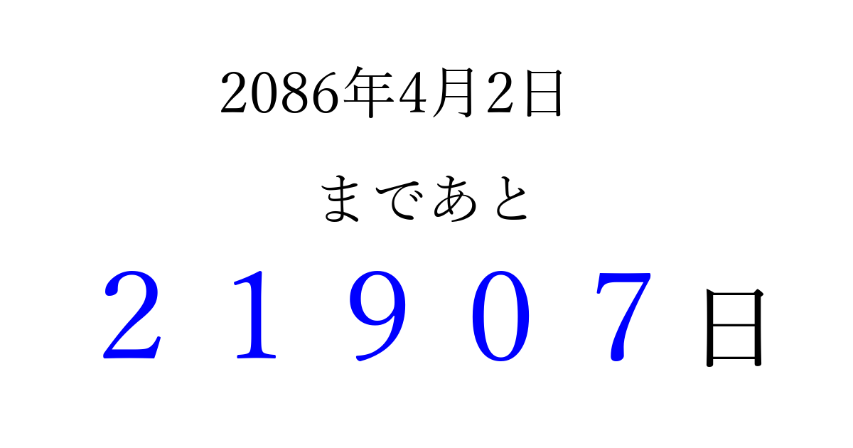 2086年4月2日(火)まで あと 99999 日です 追加すると、トップページからすぐ選べるようになります ※2026/04/10現在の結果です。 最新の状態に更新する ↓シェアして、タイムライン上にカウントダウンを表示しよう!↓ 📤 この結果を共有する Tweet シェア Threads Bluesky 別の日付でカウントダウン 2086年4月のカレンダー このページをブックマークに追加すると、いつでもカウントダウンを確認できます。 (PC: Ctrl+D / Mac: ⌘+D) hitome-notes.comでは以下のページも運営しています。 指定日と期間から日付を計算 | ガチャ確率計算・シミュレーション | プライバシー・ポリシー 運営者:Avocado