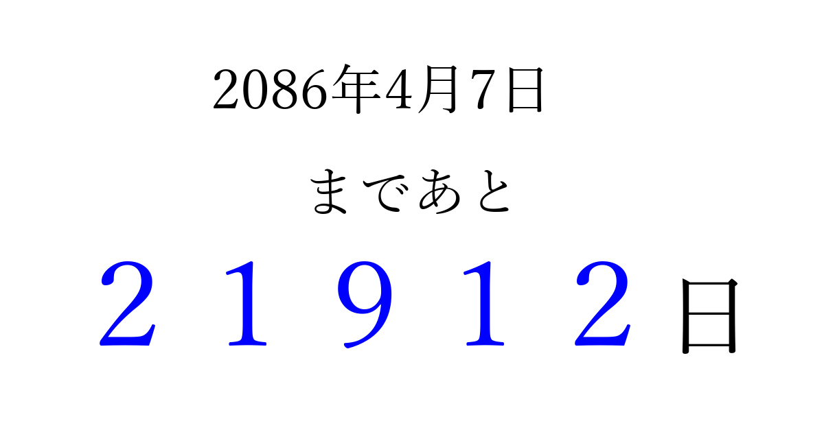 2086年4月7日(日)まで あと 99999 日です 追加すると、トップページからすぐ選べるようになります ※2026/04/10現在の結果です。 最新の状態に更新する ↓シェアして、タイムライン上にカウントダウンを表示しよう!↓ 📤 この結果を共有する Tweet シェア Threads Bluesky 別の日付でカウントダウン 2086年4月のカレンダー このページをブックマークに追加すると、いつでもカウントダウンを確認できます。 (PC: Ctrl+D / Mac: ⌘+D) hitome-notes.comでは以下のページも運営しています。 指定日と期間から日付を計算 | ガチャ確率計算・シミュレーション | プライバシー・ポリシー 運営者:Avocado