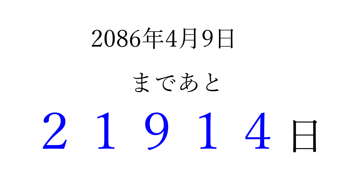 2086年4月9日(火)まで あと 99999 日です 追加すると、トップページからすぐ選べるようになります ※2026/04/10現在の結果です。 最新の状態に更新する ↓シェアして、タイムライン上にカウントダウンを表示しよう!↓ 📤 この結果を共有する Tweet シェア Threads Bluesky 別の日付でカウントダウン 2086年4月のカレンダー このページをブックマークに追加すると、いつでもカウントダウンを確認できます。 (PC: Ctrl+D / Mac: ⌘+D) hitome-notes.comでは以下のページも運営しています。 指定日と期間から日付を計算 | ガチャ確率計算・シミュレーション | プライバシー・ポリシー 運営者:Avocado