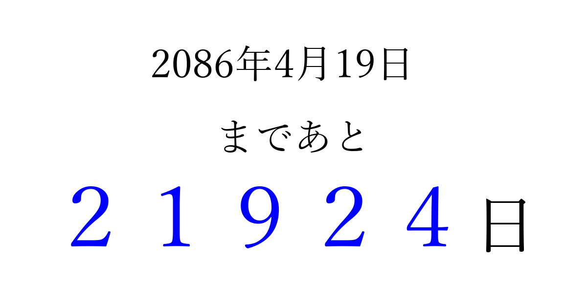 2086年4月19日(金)まで あと 99999 日です 追加すると、トップページからすぐ選べるようになります ※2026/04/10現在の結果です。 最新の状態に更新する ↓シェアして、タイムライン上にカウントダウンを表示しよう!↓ 📤 この結果を共有する Tweet シェア Threads Bluesky 別の日付でカウントダウン 2086年4月のカレンダー このページをブックマークに追加すると、いつでもカウントダウンを確認できます。 (PC: Ctrl+D / Mac: ⌘+D) hitome-notes.comでは以下のページも運営しています。 指定日と期間から日付を計算 | ガチャ確率計算・シミュレーション | プライバシー・ポリシー 運営者:Avocado