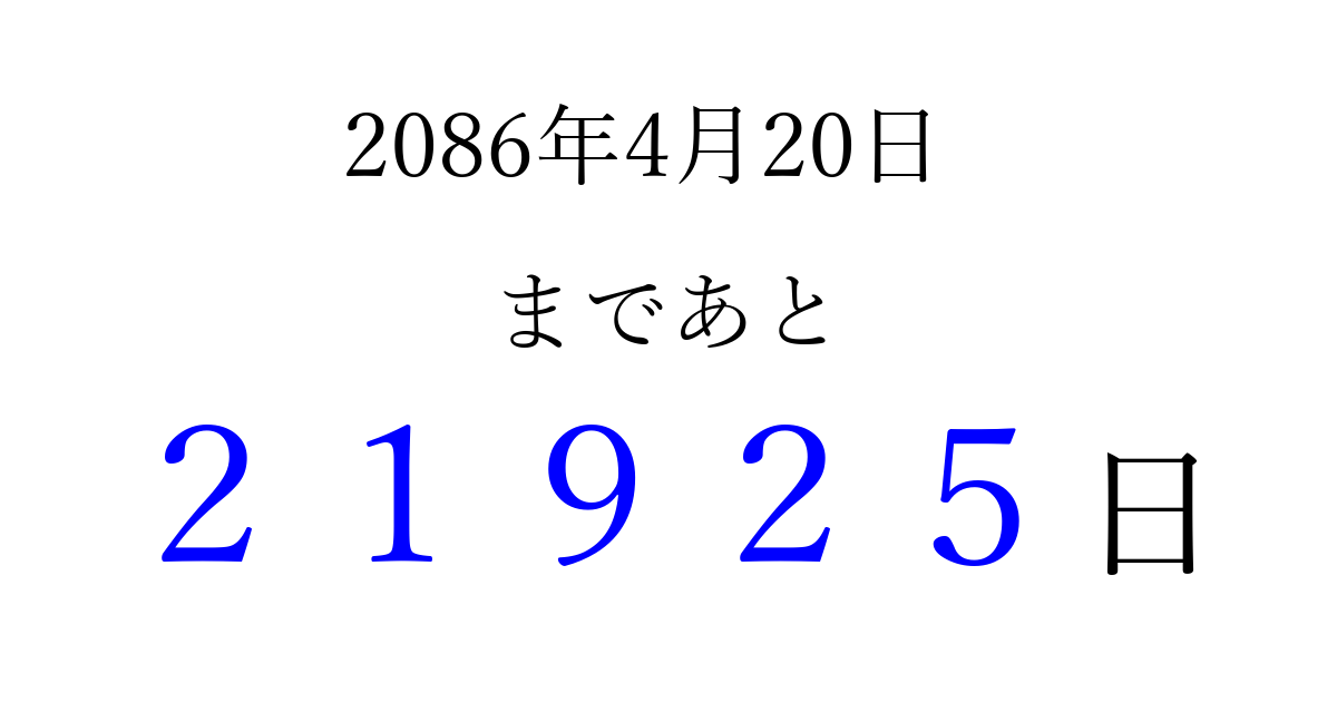 2086年4月20日(土)まで あと 99999 日です 追加すると、トップページからすぐ選べるようになります ※2026/04/10現在の結果です。 最新の状態に更新する ↓シェアして、タイムライン上にカウントダウンを表示しよう!↓ 📤 この結果を共有する Tweet シェア Threads Bluesky 別の日付でカウントダウン 2086年4月のカレンダー このページをブックマークに追加すると、いつでもカウントダウンを確認できます。 (PC: Ctrl+D / Mac: ⌘+D) hitome-notes.comでは以下のページも運営しています。 指定日と期間から日付を計算 | ガチャ確率計算・シミュレーション | プライバシー・ポリシー 運営者:Avocado
