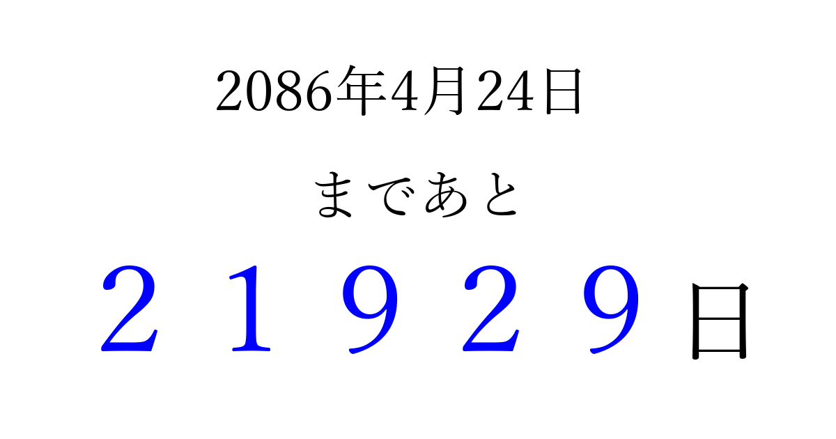 2086年4月24日(水)まで あと 99999 日です 追加すると、トップページからすぐ選べるようになります ※2026/04/10現在の結果です。 最新の状態に更新する ↓シェアして、タイムライン上にカウントダウンを表示しよう!↓ 📤 この結果を共有する Tweet シェア Threads Bluesky 別の日付でカウントダウン 2086年4月のカレンダー このページをブックマークに追加すると、いつでもカウントダウンを確認できます。 (PC: Ctrl+D / Mac: ⌘+D) hitome-notes.comでは以下のページも運営しています。 指定日と期間から日付を計算 | ガチャ確率計算・シミュレーション | プライバシー・ポリシー 運営者:Avocado