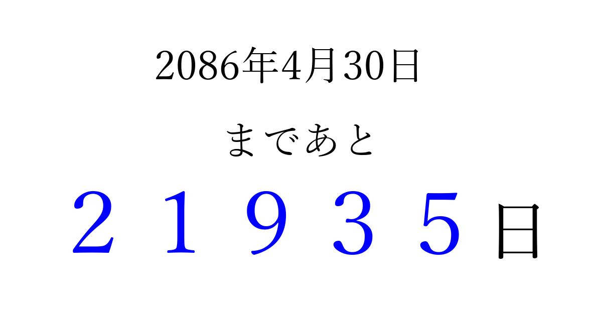 2086年4月30日(火)まで あと 99999 日です 追加すると、トップページからすぐ選べるようになります ※2026/04/10現在の結果です。 最新の状態に更新する ↓シェアして、タイムライン上にカウントダウンを表示しよう!↓ 📤 この結果を共有する Tweet シェア Threads Bluesky 別の日付でカウントダウン 2086年4月のカレンダー このページをブックマークに追加すると、いつでもカウントダウンを確認できます。 (PC: Ctrl+D / Mac: ⌘+D) hitome-notes.comでは以下のページも運営しています。 指定日と期間から日付を計算 | ガチャ確率計算・シミュレーション | プライバシー・ポリシー 運営者:Avocado
