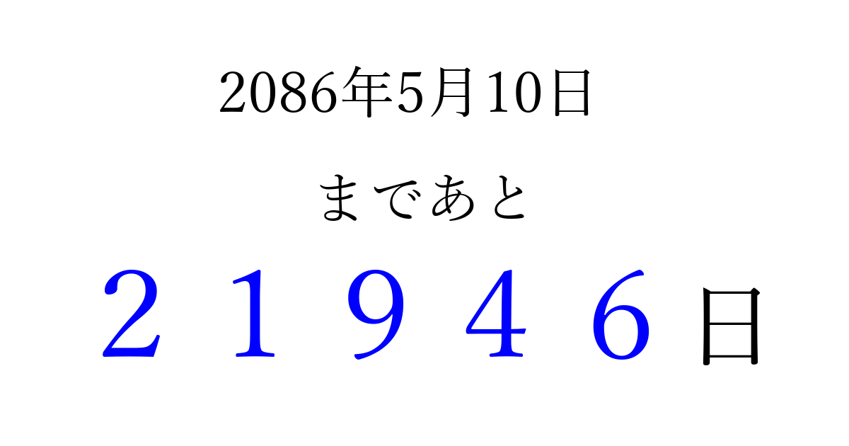 2086年5月10日(金)まで あと 99999 日です 追加すると、トップページからすぐ選べるようになります ※2026/04/09現在の結果です。 最新の状態に更新する ↓シェアして、タイムライン上にカウントダウンを表示しよう!↓ 📤 この結果を共有する Tweet シェア Threads Bluesky 別の日付でカウントダウン 2086年5月のカレンダー このページをブックマークに追加すると、いつでもカウントダウンを確認できます。 (PC: Ctrl+D / Mac: ⌘+D) hitome-notes.comでは以下のページも運営しています。 指定日と期間から日付を計算 | ガチャ確率計算・シミュレーション | プライバシー・ポリシー 運営者:Avocado