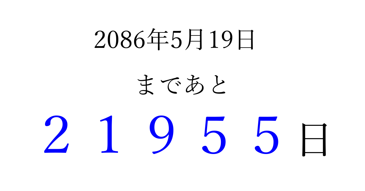 2086年5月19日(日)まで あと 99999 日です 追加すると、トップページからすぐ選べるようになります ※2026/04/09現在の結果です。 最新の状態に更新する ↓シェアして、タイムライン上にカウントダウンを表示しよう!↓ 📤 この結果を共有する Tweet シェア Threads Bluesky 別の日付でカウントダウン 2086年5月のカレンダー このページをブックマークに追加すると、いつでもカウントダウンを確認できます。 (PC: Ctrl+D / Mac: ⌘+D) hitome-notes.comでは以下のページも運営しています。 指定日と期間から日付を計算 | ガチャ確率計算・シミュレーション | プライバシー・ポリシー 運営者:Avocado