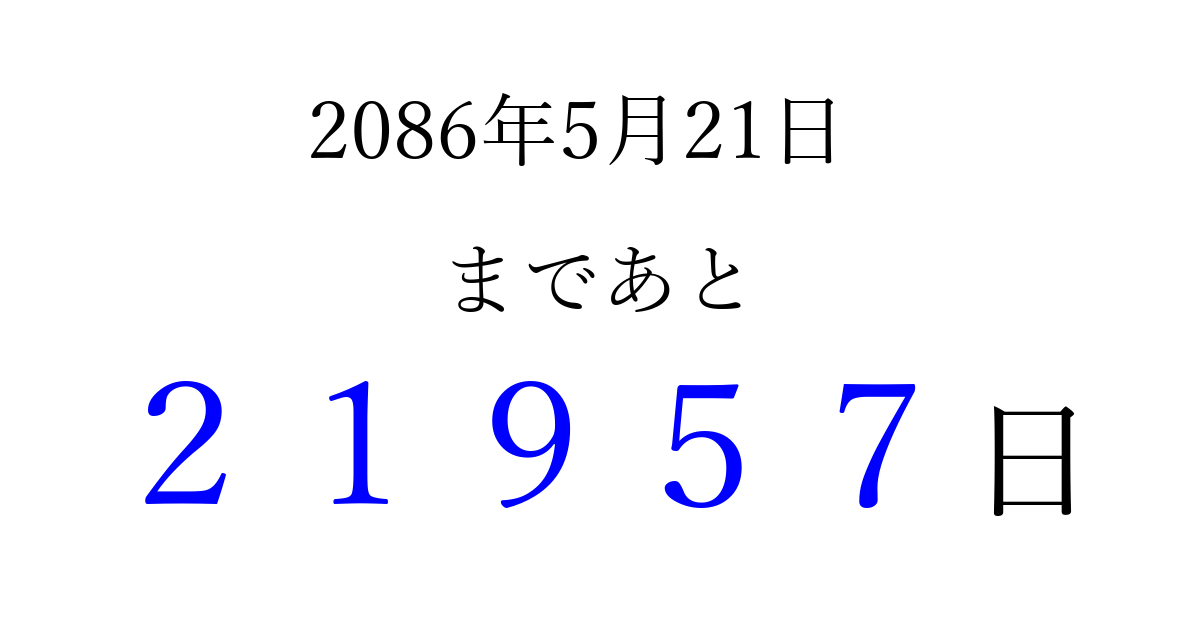 2086年5月21日(火)まで あと 99999 日です 追加すると、トップページからすぐ選べるようになります ※2026/04/09現在の結果です。 最新の状態に更新する ↓シェアして、タイムライン上にカウントダウンを表示しよう!↓ 📤 この結果を共有する Tweet シェア Threads Bluesky 別の日付でカウントダウン 2086年5月のカレンダー このページをブックマークに追加すると、いつでもカウントダウンを確認できます。 (PC: Ctrl+D / Mac: ⌘+D) hitome-notes.comでは以下のページも運営しています。 指定日と期間から日付を計算 | ガチャ確率計算・シミュレーション | プライバシー・ポリシー 運営者:Avocado